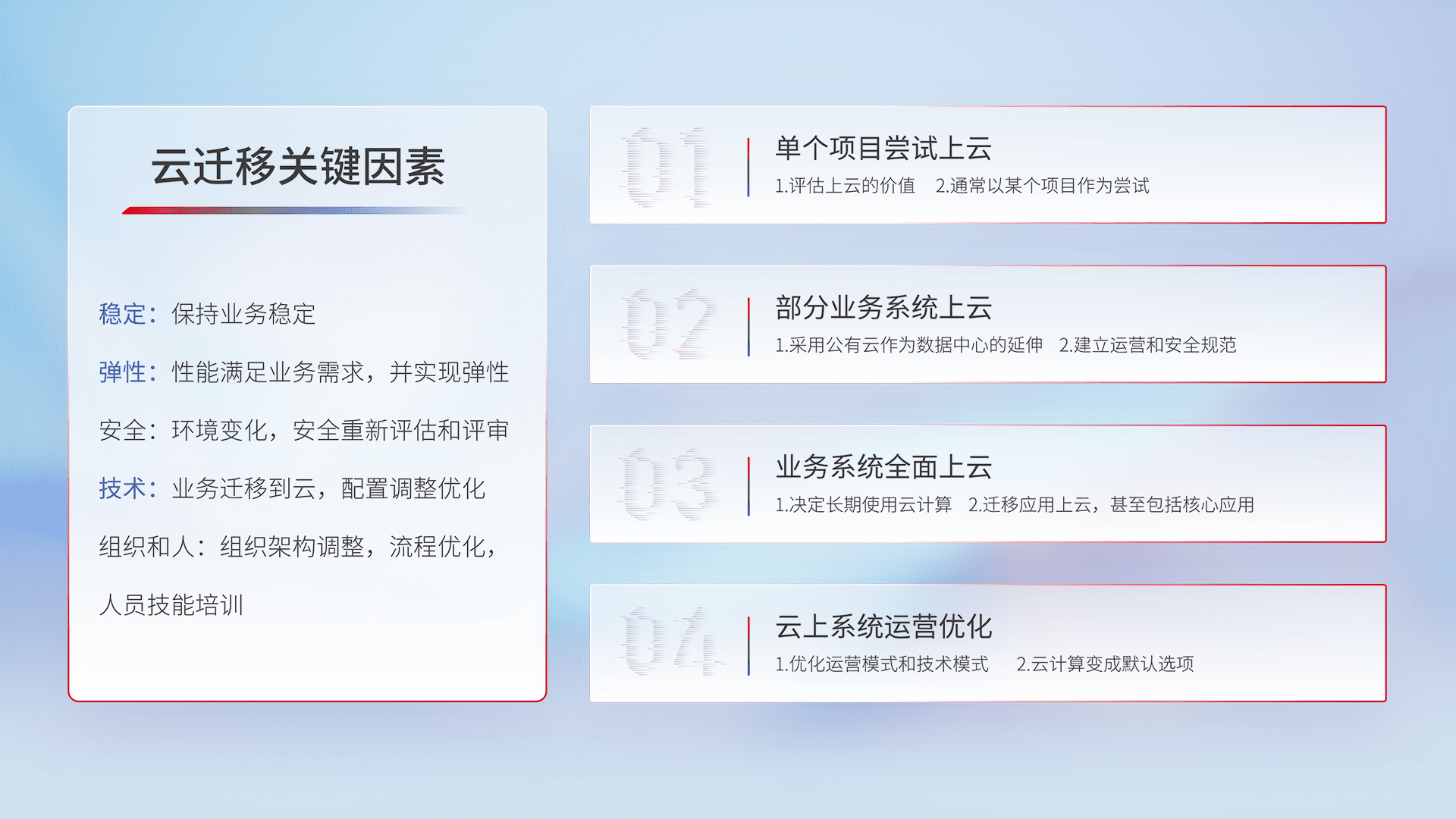 结合实际业务,,,从规划设计、、、、云平台选型、、云原生改造、、数据迁移、、、集成交付,,,迁移全过程为客户识别最佳上云路径,,,,做好风险识别管理,,,设计网络架构、、身份权限、、、、安全审计合规、、操作审计、、、日志审计、、监控告警策略、、、多站点容灾设计等,,,对云上基础设施进行整体规划,,,提升IT治理水平,,,以满足弹性、、高可用、、、、高性能的需求。。。。