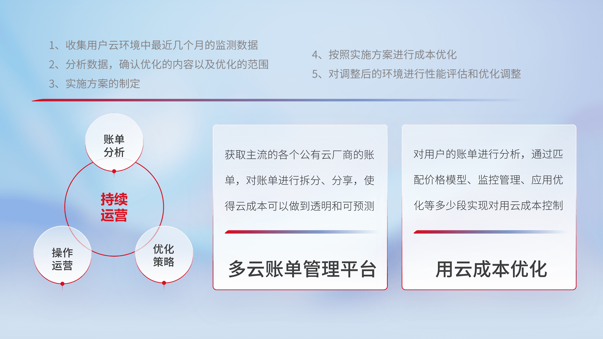 通过多云纳管,,以统一的资源数据模型把客户的云资源进行抽象和封装,,,进而实现对多云资源的统一操作,,,,保障云资源管理的可靠性、、、稳定性与可用性。。。量身定制化运维内容,,,配置、、、、开发运维、、、、补丁管理、、、备份、、、监控、、、、认证和访问管理、、审计和日常巡检等,,,保障在用云过程中的可靠度,,,稳定度以及高可用率。。